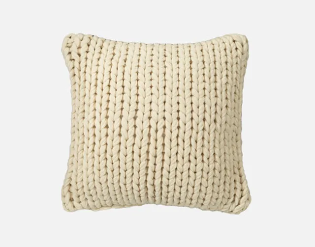 QE Home exclusive; Corded acrylic knit surface; Machine washable & dryable; Give your room a cute & cozy touch with our Corded Knit Square Cushion in Natural, a a sandy white! This stylish accessory features a classic corded knit surface, matched with a